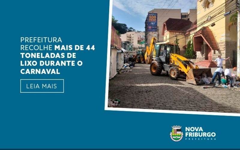 A Prefeitura de Nova Friburgo, através da Secretaria de Serviços Públicos, divulgou nesta sexta-feira, 24, o balanço da quantidade de lixo retirada nos seis dias de Carnaval. No total, conforme pesagem informada pela Empresa Brasileira de Meio Ambiente – EBMA, foram recolhidas 44.230 quilos de lixo no eixo central do município.