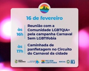 No dia 16/02, quinta-feira, às 16h, haverá uma reunião com a comunidade LGBTQIA+ pela campanha Carnaval sem LGBTIfobia. Às 17h haverá uma caminhada de panfletagem no circuito do carnaval da cidade. No dia 17/02, sexta-feira, às 13h, panfletagem e distribuição de ventarola no circuito do carnaval da cidade, em bares, restaurantes, palanques e outros.