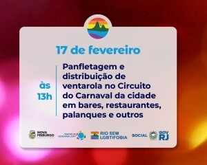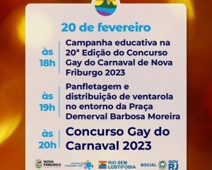E no dia 20/02, segunda-feira, a programação inclui, a partir das 18h, campanha educativa na 20ª edição do Concurso Gay do Carnaval de Nova Friburgo 2023. Além disso haverá panfletagem e distribuição de ventarola no entorno da Praça Dermeval Barbosa Moreira. O ponto alto será o Concurso Gay do Carnaval, evento tradicional do carnaval friburguense e que acontecerá às 20h.