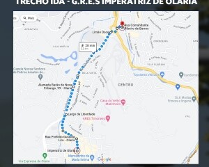 Rua Manoel Lourenço Sobrinho (interrupção de fluxo de veículos e proibição de estacionamento no dia 16 de fevereiro, às 14h, após o término da Feira); Rua Gustavo Lira (interrupção do fluxo de veículos e proibição de estacionamento a partir do n° 89); Avenida Julio Antônio Thurler (haverá interrupção temporária ao longo de todo o trecho para o deslocamento); Alameda Barão de Nova Friburgo (o deslocamento seguirá pelo contrafluxo da Alameda Barão de Nova Friburgo - sentido Olaria/Cônego - e o trânsito de veículos será desviado para Rua Jardel Hottz para acesso a Av. José Pires Barroso – Via Expressa; Av. Conselheiro Julius Arp (o deslocamento seguirá pelo contrafluxo até a Praça Marcílo Dias - Paissandu. Durante o percurso, a via sentido Centro terá implantação de duplo sentido de circulação. O trecho compreendido entre o Acesso 1 do Espaço Arp até n°06 da Av. Conselheiro Julius Arp, terá proibição de estacionamento na data do deslocamento); Praça Marcílio Dias – Paissandu (o deslocamento seguirá no contrafluxo. Haverá interrupção temporária para a travessia até o ponto de posicionamento); Rua Comandante Ribeiro de Barros (a via terá proibição de estacionamento do n° 03 ao 17 até o término do evento).