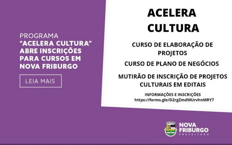 A Secretaria Municipal de Políticas Culturais da Prefeitura de Nova Friburgo e o Instituto Serrano de Economia Criativa abrem inscrições para os cursos de capacitação e consultorias de elaboração de projetos e planos de negócios no programa “Acelera Cultura”. As atividades estão divididas em três conteúdos e formatos: Curso de Elaboração de Projetos (on-line e presencial); Plano de Negócios (presencial); e Mutirão de Enquadramento de Projetos (presencial). As aulas presenciais acontecem na Biblioteca Municipal Maria Margarida Liguori, que fica na Rua Farinha Filho, nº 50 – Centro.