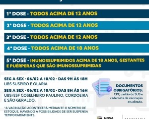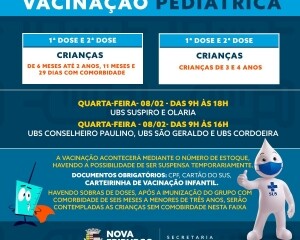 A imunização das outras idades continua, já que os imunizantes são diferentes e específicos para cada grupo. Sendo assim, a vacinação pediátrica, até os 4 anos, ocorre na quarta-feira, 8 de janeiro. Já todos acima dos 12 anos poderão receber a vacina de segunda a sexta-feira.