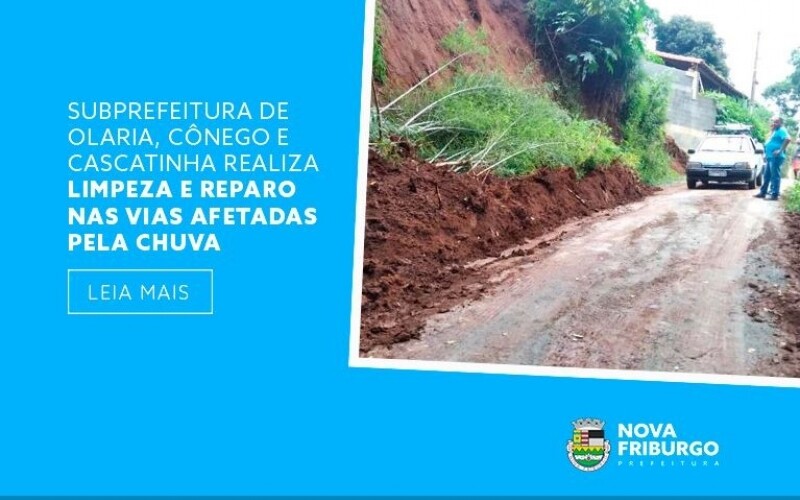 A Prefeitura de Nova Friburgo, por meio da Subprefeitura de Olaria, Cônego e Cascatinha, está realizando a limpeza e reparo das vias que vem sendo afetadas pelas chuvas constantes na cidade. Desde o último domingo, 22, os serviços estão sendo executados nos trechos da Granja do Céu, no Sítio São Luiz e Garrafão. A equipe está utilizando máquinas no local e conta com o apoio das Secretarias Municipais de Obras e Defesa Civil.