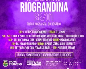 A Prefeitura Municipal de Nova Friburgo, juntamente com moradores e amigos de Riograndina, vai celebrar os 99 anos do distrito em evento no próximo sábado, 28/01, na Praça Nossa Senhora do Rosário, das 13h às 17h. A organização é das Secretarias Municipais de Cultura, Esportes e Lazer e Saúde.