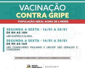 Somente a imunização é capaz de combater a influenza, ainda mais nesta época do ano, que é tão comum o contágio de doenças respiratórias. Todos os cidadãos com mais de seis meses podem receber a dose, que é aplicada de segunda a sexta-feira, 16 a 20 de janeiro, nas Unidades Básicas de Saúde do Suspiro, Olaria, Conselheiro Paulino, Cordoeira e São Geraldo.