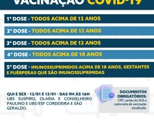 A imunização ocorre nas Unidades Básicas de Saúde do Suspiro, Olaria, Conselheiro Paulino, Cordoeira e São Geraldo em horários diversos que podem ser conferidos na arte em anexo. A primeira, segunda, terceira, quarta e quinta doses estão disponíveis para os grupos que possuem as recomendações.