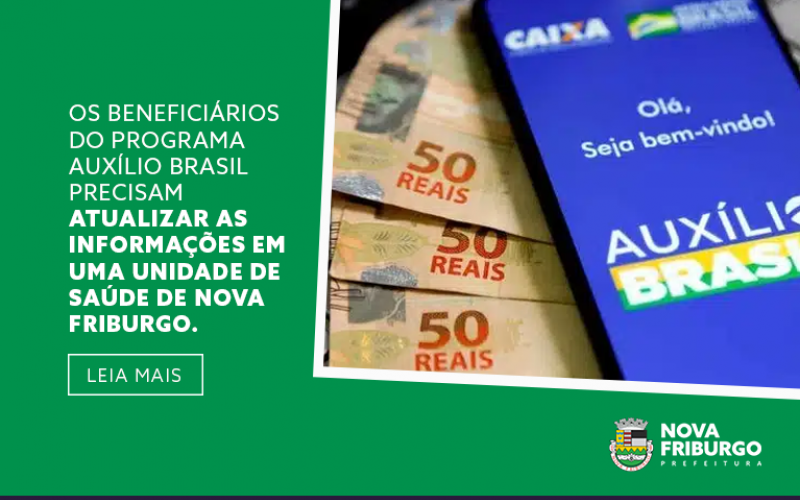 Atenção: os beneficiários do programa Auxílio Brasil do Governo Federal precisam atualizar as informações relacionadas à saúde em uma Unidade Básica de Nova Friburgo. A Secretaria Municipal de Saúde orienta que todos busquem a renovação do acompanhamento em qualquer posto de saúde do município.