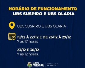 Confira a seguir os horários de funcionamento das Unidades Básicas de Saúde do Suspiro (Dr. Sylvio Henrique Braune) e de Olaria (Dr. Tunney Kassuga) nas últimas semanas de 2022.