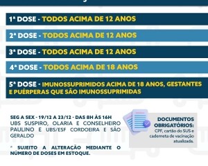 A primeira dose está disponível para os bebês com mais de 6 meses e toda a população. Já a segunda dose está liberada para todos com mais de 3 anos. A terceira dose pode ser tomada por quem tem mais de 18 anos e a quarta aplicação em quem tem mais de 12. A quinta dose segue disponível para imunossuprimidos conforme orientação dos órgãos superiores.