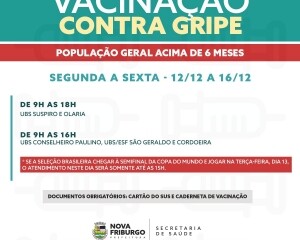 A Prefeitura de Nova Friburgo, por meio da Secretaria Municipal de Saúde, prossegue oferecendo a vacina contra gripe para toda a população acima de seis meses de idade. A aplicação acontece nas unidades de saúde, de segunda à sexta-feira, de 12 a 16 de dezembro.