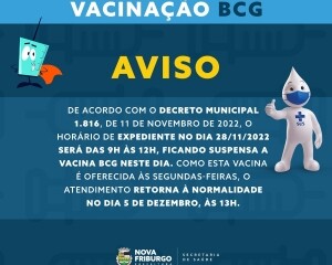 Sobre a vacinação BCG - De acordo com o Decreto Municipal 1.816, de 11 de novembro de 2022, o horário de expediente no dia 28/11/2022 será das 9h às 12h, ficando SUSPENSA a vacinação BCG neste dia. Como esta vacina é oferecida às segundas-feiras, o atendimento retorna à normalidade no dia 5 de dezembro, às 13h.
