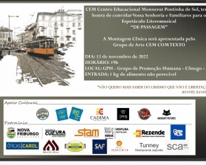 Para quem deseja conhecer a importância da Semana de Arte Moderna na história da cultura brasileira, o espetáculo lítero-musical “De Passagem”, dirigido por Jane Ayrão é uma excelente recomendação. A estreia será no dia 13 de novembro, as 19h no prédio do Grupo de Promoção Humana, GPH, no Cônego. O evento é gratuito e pede-se para levar 1kg de alimento não perecível.
