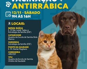 A Secretaria Municipal de Saúde, por meio da Subsecretaria de Vigilância em Saúde, continua com a campanha contra a raiva em Nova Friburgo. A próxima etapa contemplará, no próximo sábado, 12 de novembro, os bairros Nova Suíça, Catarcione, Varginha, Ponte da Saudade, Cordoeira e Ypu.