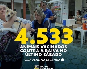 A Secretaria Municipal de Saúde, através da equipe da Subsecretaria de Vigilância em Saúde, vacinou 4.533 animais no último sábado, 5, em mais uma etapa da campanha de vacinação antirrábica realizada em Nova Friburgo. As equipes estiveram no Centro, Olaria, Lagoinha, Bela Vista, Cascatinha, Cônego e Vargem Grande.