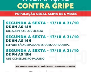 Das 8 às 18 horas acontece a imunização na UBS de Olaria e do Suspiro. Das 8 às 16 horas, nas UBS/ESF de São Geraldo e Cordoeira. Das 09 às 15 horas, na UBS de Conselheiro Paulino. É necessário ter em mãos cpf, cartão do SUS e caderneta de vacinação.