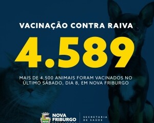 No último sábado, 8, a Secretaria Municipal de Saúde de Nova Friburgo, através da equipe da Vigilância Ambiental, realizou a vacinação contra a raiva em 4.589 animais em Conselheiro Paulino, Riograndina, Maria Tereza, Floresta, Parque das Flores e Prado.