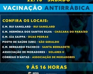 Já na outra semana, no dia 22, a imunização volta pra zona urbana. Os bairros contemplados serão: Rui Sanglard, Chácara do Paraíso, Duas Pedras, São Geraldo, Santa Bernadete, Solares II e Córrego D’antas.