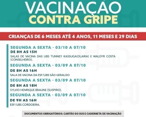 A partir dos cinco anos, crianças, adolescentes, jovens, adultos e idosos recebem a vacina na Unidade Básica de Saúde de Olaria, Suspiro, Conselheiro Paulino, Cordoeira e São Geraldo. Confira os horários na imagem em anexo.
