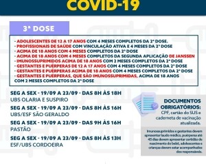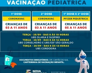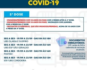 A quinta dose está disponível para os grupos prioritários. A quarta para todos acima de 18 anos. Já a terceira aplicação pode ser feita em todos acima de 12 anos. A segunda e primeira doses estão disponíveis para todas as idades, a partir dos 3 anos.