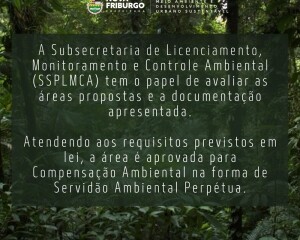 Cerca de 40 mil metros quadrados de florestas nativas do bioma Mata Atlântica estão garantido para preservação perpétua dentro do município de Nova Friburgo. A destinação de área para conservação é uma das opções de compensação ambiental disponíveis no art. 4 da Resolução INEA 89/2014. A ação se dá entre munícipes que possuem compromissos ambientais e escolhem a forma de destinar área para conservação, como quitação dos compromissos ambientais, podendo firmar acordo com os proprietários de áreas de floresta nativa com as mesmas características ecológicas da área na qual houve a supressão.