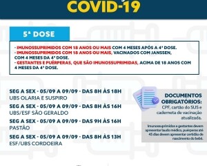 A vacinação contra a covid-19 em Nova Friburgo segue acontecendo em Nova Friburgo pela Prefeitura na próxima semana. A quinta dose estará disponível para imunossuprimidos, gestantes e puérperas que são imunossuprimidas. Já a quarta dose está sendo ofertada para todos com mais de 18 anos.