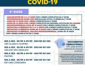 A terceira aplicação está disponível para os adolescentes com mais de 12 anos e toda a população acima dessa idade. As segundas e primeiras doses também estão sendo oferecidas nas unidades de saúde.