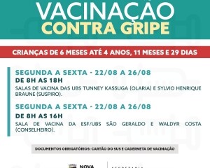 As crianças de 6 meses até 4 anos, 11 meses e 29 dias devem receber a dose nas salas de vacina das unidades básicas de saúde. A outra parte da população, com mais de 5 anos, poderá receber a vacina de segunda a sexta-feira, nos postos do município.