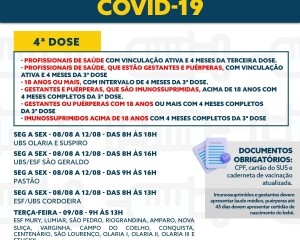 O primeiro reforço, a terceira dose, está disponível para todos com mais de 12 anos. Já a quarta dose segue sendo oferecida para toda a população acima de 18 anos.