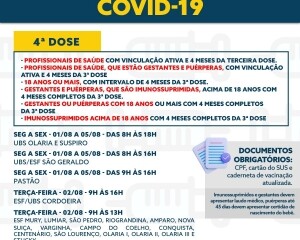 Para a próxima semana, a Secretaria Municipal de Saúde inseriu a população acima de 18 anos na campanha de quarta dose contra a covid-19. Todos acima dos 18 anos, que já tomaram a terceira aplicação há quatro meses, poderão receber a vacina a partir de segunda-feira, 01.
