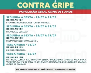 A população acima de cinco anos, dentre eles, adultos, idosos e grupos prioritários também podem receber a vacina de segunda a sexta nas unidades básicas. Na terça, 26, a campanha será realizada nas Estratégias de Saúde da Família dos bairros: Mury, Lumiar, São Pedro da Serra, Riograndina, Amparo, Nova Suíça, Varginha, Campo do Coelho, Conquista, Centenário, São Lourenço, Olaria I, Olaria II e Olaria III.