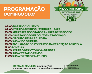 Nova Friburgo terá, entre os dias 29 e 31 de julho, a edição 2022 da Festa do Produtor Rural. O evento, com entrada gratuita, será realizado na Ceasa, em Conquista, e terá atrações como shows, recreação infantil, fazendinha, mostra de produtos, gastronomia, feira de negócios, concursos, entre outras.