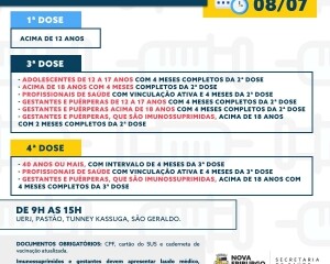 A Prefeitura de Nova Friburgo decidiu estender a vacinação contra a COVID-19 na sexta-feira, 07. A vacinação de quarta e terceira dose ocorre das 9h às 15h nas Unidades Básicas de Saúde: Universidade Estadual do Rio de Janeiro (UERJ), Ginásio Poliesportivo Alberto da Rosa Pinheiro (Pastao), Posto Dr. Tunney Kassuga (Olaria) e UBS/ESF de São Geraldo.