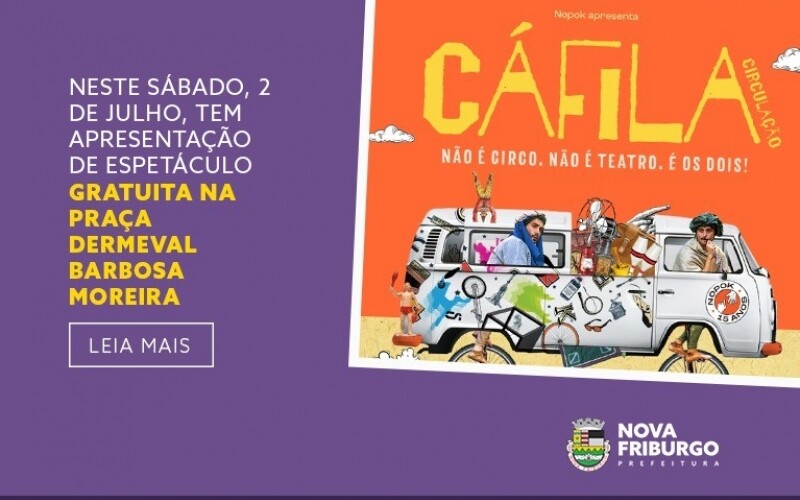 A Nopok e a Fundação Nacional de Artes (Funarte), com apoio da Prefeitura de Nova Friburgo, através das secretarias de Cultura, Educação e Esportes e Lazer, apresenta gratuitamente neste sábado, 2 de julho, a partir das 11h, na Praça Dermeval Barbosa Moreira, no Centro, o espetáculo “Cáfila – Não é circo. Não é teatro. É os dois!”.