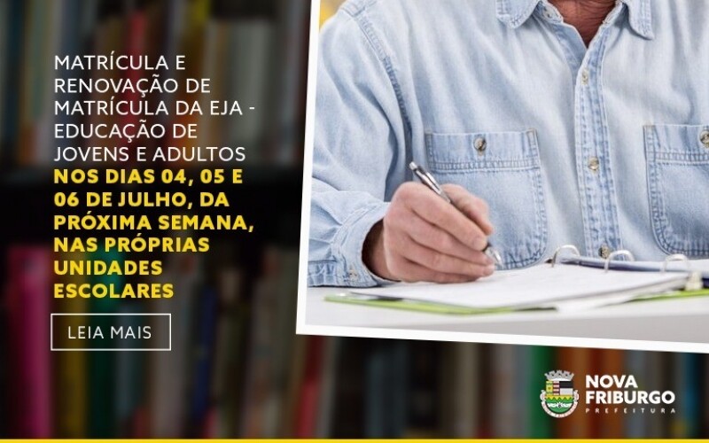 A Prefeitura de Nova Friburgo publicou a portaria que define os procedimentos relacionados à matrícula e renovação de matrícula da EJA - Educação de Jovens Adultos. Nos dias 04, 05 e 06 julho ocorrerá, nas próprias unidades escolares, a renovação de matrícula e a efetivação de matrículas novas. O início do 2º semestre ocorrerá no dia 15 de julho, sexta-feira.