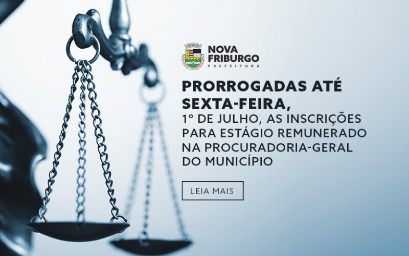Devido à grande procura, a Prefeitura de Nova Friburgo decidiu prorrogar até a próxima sexta-feira, 1º de julho, o prazo de inscrições para formação do quadro de estagiários da Procuradoria-Geral do Município de Nova Friburgo. O candidato poderá efetuar sua inscrição presencialmente na sede da Procuradoria-Geral ou por meio do endereço eletrônico estagiopgmnf@gmail.com, entregando ou enviando até a data limite os documentos e informações solicitadas no edital.
