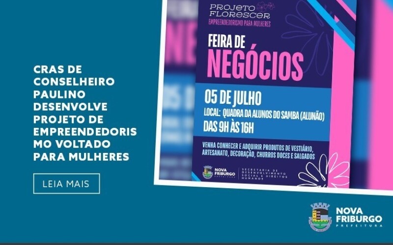 A Secretaria de Desenvolvimento Social e Direitos Humanos de Nova Friburgo, por meio do Cras de Conselheiro Paulino, realiza na próxima sexta-feira, 5 de julho, a primeira Feira de Negócios do Projeto Florescer, iniciativa que promove o empreendedorismo feminino no município.