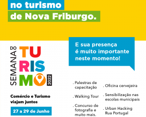 A Semana do Turismo 2022 será presencial e oferece muitas novidades para este ano. A programação será dividida entre palestras de capacitação no auditório da Associação Comercial, Industrial e Agrícola de Nova Friburgo (Acianf), Walking Tour (passeios guiados, realizados a pé) pelo centro histórico de Nova Friburgo, concurso de fotografia com o tema “Patrimônio Histórico Cultural de Nova Friburgo” e urban hacking (revitalização de espaço público) da Rua Portugal.
