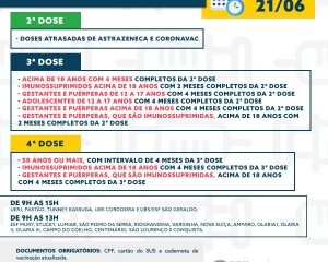 Os adolescentes que já tomaram a 2ª dose há pelo menos quatro meses poderão receber o reforço da covid-19 na segunda-feira, 20. Os adultos com mais de 50 anos poderão receber a 4ª dose na terça-feira, 21. Neste dia também haverá a aplicação da 3ª e da 2ª dose. Já os profissionais de saúde deverão receber o segundo reforço na quarta-feira, 22.
