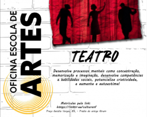 TEATRO – Desenvolve processos mentais como concentração, memorização e imaginação, desenvolve competências e habilidades, potencializa a criatividade e aumenta a autoestima. Crianças e jovens de 9 a 17 anos são o público-alvo, com aulas às terças e quintas-feiras.