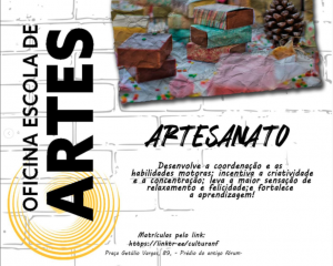 ARTESANATO – Desenvolve a coordenação e as habilidades motoras, incentiva a criatividade e a concentração; leva a maior sensação de relaxamento e felicidade e fortalece a aprendizagem. É destinado a crianças entre 5 e 12 anos e as aulas são aplicadas às terças-feiras.