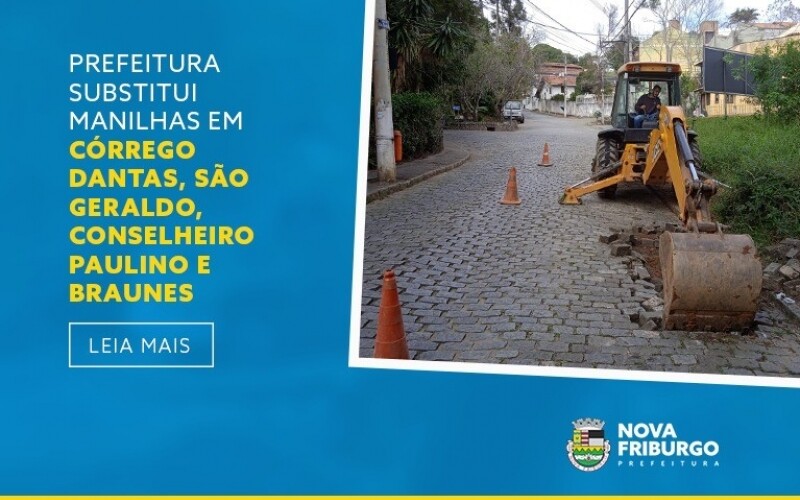 A equipe de manilhamentos da Secretaria de Obras instalou novas manilhas para captação de água em ruas dos bairros Córrego Dantas, São Geraldo, Braunes, Ypu e no distrito de Conselheiro Paulino. Mais ações de rotina foram realizadas em outros pontos da cidade como realização de pequenas obras e recuperação de paralelos.