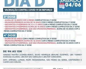 A imunização de 4ª dose estará disponível para todos os idosos com mais de 60 anos, imunossuprimidos, gestantes e puérperas. Já a 3ª aplicação será feita em todos com mais de 18 anos que já completaram quatro meses desde que receberam a 2ª dose. A vacinação dos adolescentes terá início na próxima semana.