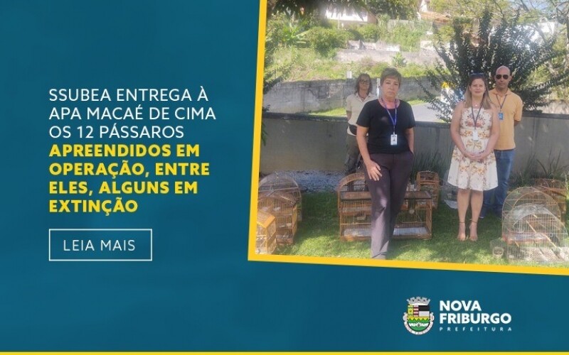 De modo a concluir a ação iniciada na terça-feira, 26 de abril, que resultou na apreensão de mais de uma dezena de pássaros - além de gaiolas e um coelho -, a Subsecretaria Municipal do Bem-Estar Animal (Ssubea), por meio da titular da pasta, Elisângela Rodrigues, promoveu nesta quarta-feira, 27 de abril, o repasse da posse das aves à Área de Proteção Ambiental de Macaé de Cima (APAMC/Inea), que fica no distrito de Lumiar.