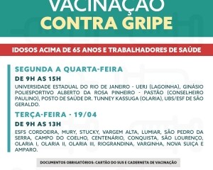 A imunização contra a gripe acontecerá de segunda a quarta-feira, das 09 às 15 horas, nas Unidades Básicas de Saúde de Conselheiro Paulino, Olaria, São Geraldo e na Universidade Estadual do Rio de Janeiro (Uerj). E na terça-feira, 19, das 9 às 13 horas, nas seguintes Estratégias de Saúde da Família (ESF): Cordoeira, Mury, Stucky, Vargem Alta, Lumiar, São Pedro da Serra, Campo do Coelho, Centenário, Conquista, São Lourenço, Olaria I, Olaria II, Olaria III, Riograndina, Varginha, Nova Suíça e Amparo.