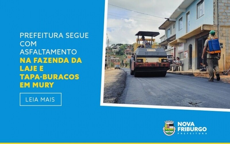 A Prefeitura segue nesta semana com o trabalho de pavimentação usando asfalto quente na Fazenda da Laje, no distrito de Conselheiro Paulino. Esta etapa do programa “Asfalto Presente”, parceria entre os governos municipal e estadual, teve início no dia 31 de março, no trecho da estrada próximo ao cemitério Trilha do Céu.