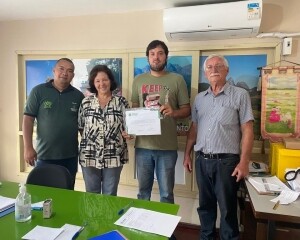 Os certificados do curso de “Operação e Manutenção de Motosserra” foram entregues ao secretário de Serviços Públicos, Eduardo Trigo, pelo presidente do Sindicato Rural patronal, Pércio Portz, e pelos funcionários da Secretaria Municipal de Agricultura, Marcelo Silva e Angela Carvalho.
