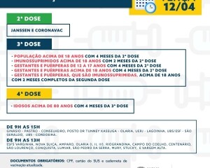A quarta dose continuará sendo oferecida para os idosos com mais de 80 anos, que já completaram quatro meses da terceira aplicação, na terça-feira, 12. Ainda nesse dia, a terceira dose também será oferecida para todos os grupos no município. Além da repescagem de segunda dose com a Coronavac e Janssen.