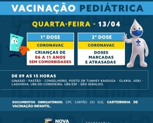 A campanha pediátrica será feita na quarta e quinta-feira. No dia 13, haverá a primeira e segunda dose da Coronavac para as crianças com 6 a 11 anos, sem comorbidades. Já no dia 14, a imunização será realizada com a Pfizer pediátrica para todos os menores com 5 a 11 anos.