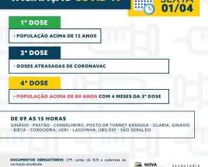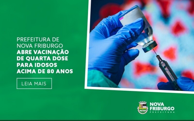 Seguindo a recomendação do Ministério da Saúde, a Secretaria Municipal de Saúde de Nova Friburgo realizará a vacinação contra a Covid-19 com a quarta dose para a população com mais de 80 anos, que já recebeu a terceira aplicação há pelo menos quatro meses, na próxima sexta-feira, 01.