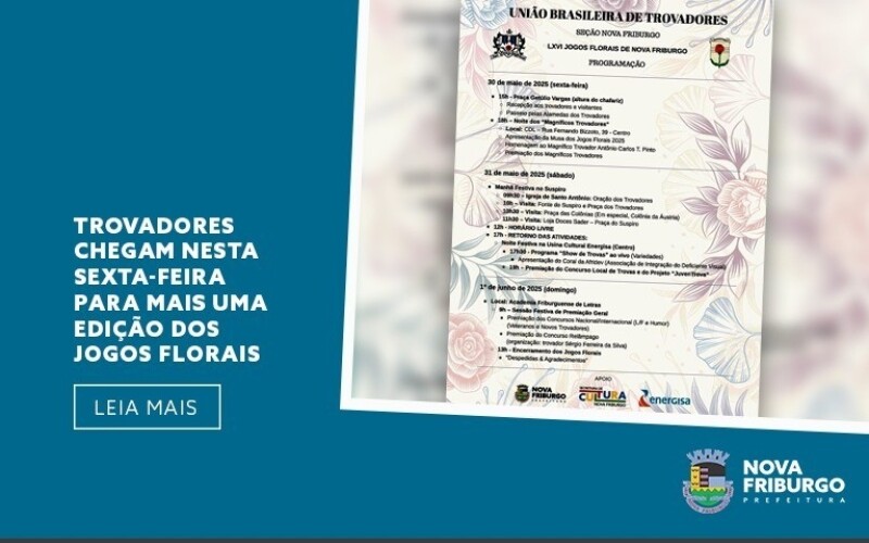 A União Brasileira de Trovadores – Seção Nova Friburgo (UBT-NF) promove a 66ª edição dos Jogos Florais de Nova Friburgo. O evento gratuito, que conta com o apoio da Prefeitura de Nova Friburgo, por meio da Secretaria Municipal de Cultura, e da Energisa, tem início nesta sexta-feira, 30 de maio, às 15h, na Praça Getúlio Vargas, no Centro, na altura do chafariz, quando serão recepcionados os trovadores e visitantes, seguindo-se um passeio pela Alameda dos Trovadores.